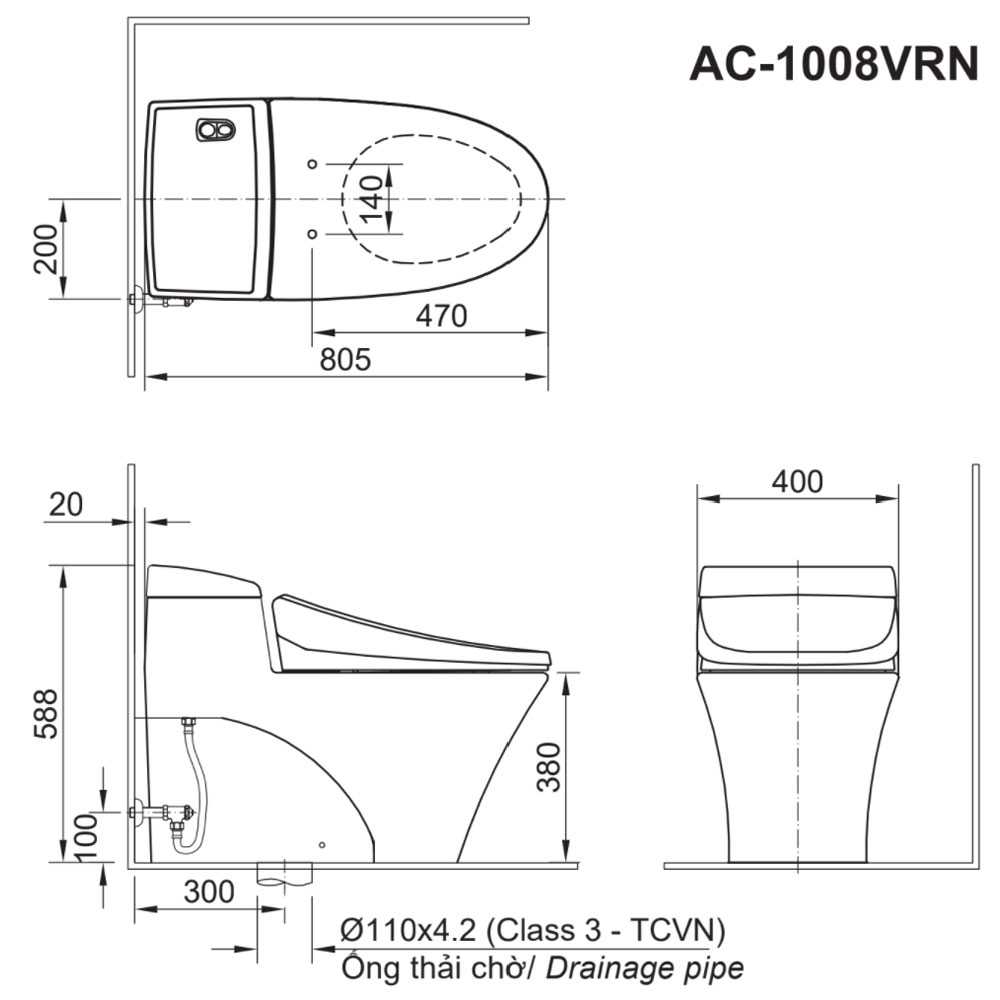 • Bồn cầu AC-1008VRN được thiết kế tương đối to, phù hợp các phòng có diện tích vừa và rộng rãi.