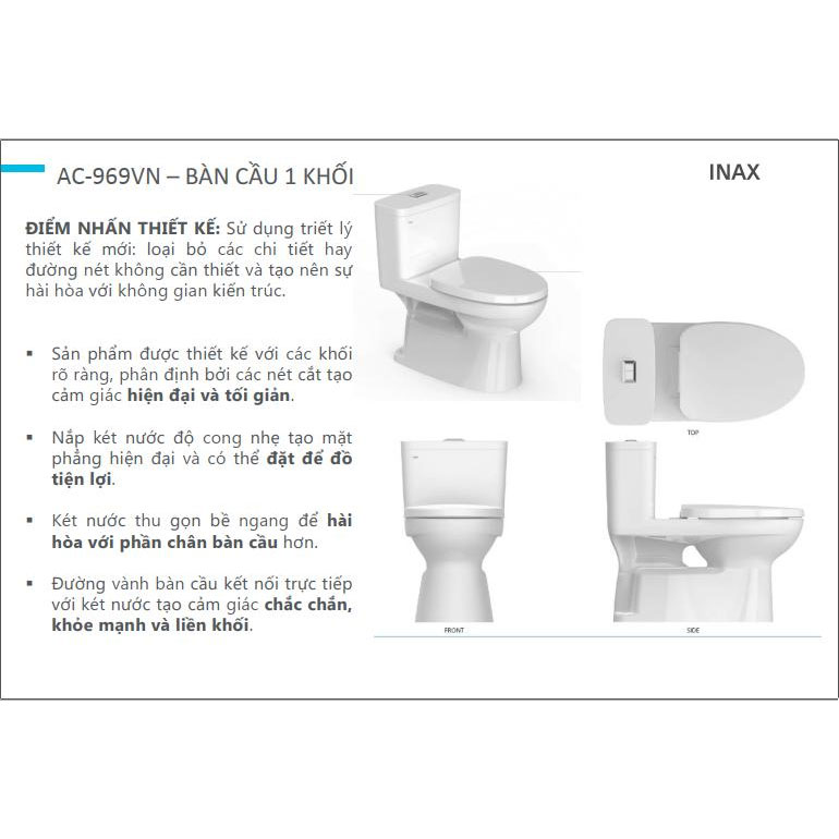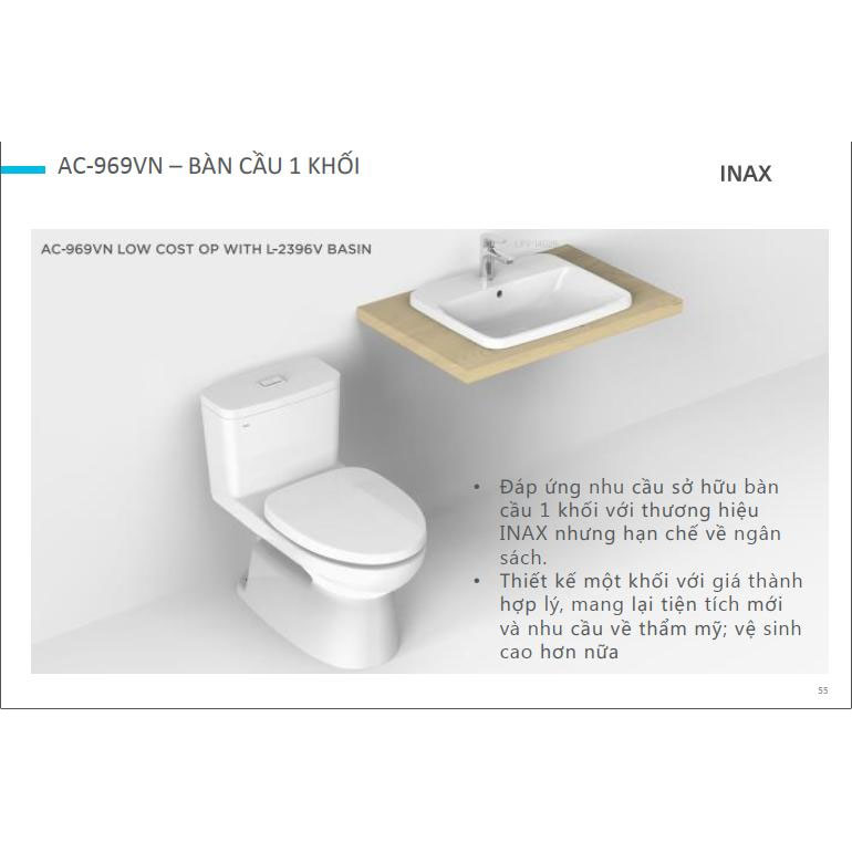 Với hành trình phát triển bền vững, thiết bị vệ sinh INAX luôn chiếm được cảm tình của đông đảo người tiêu dùng Việt. Trong đó, bồn cầu 1 khối INAX AC-969VN (Bệt INAX 969) là một trong những lựa chọn nổi bật nhờ ứng dụng công nghệ tiên tiến về chất liệu và tính năng. Điểm cộng lớn là thiết kế phù hợp với không gian nội thất Việt, kèm mức giá hợp lý, khiến người dùng dễ dàng tiếp cận và tin tưởng lựa chọn.