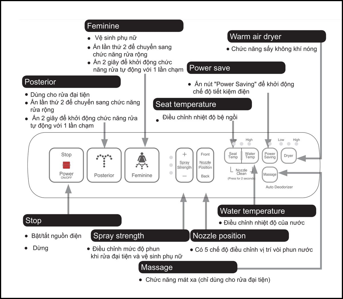 - Sưởi ấm bệ ngồi với 6 mức điều chỉnh nhiệt độ