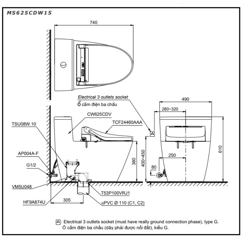Bản vẽ kỹ thuật bồn cầu 1 khối nắp điện tử TOTO MS625CDW15 giấu dây