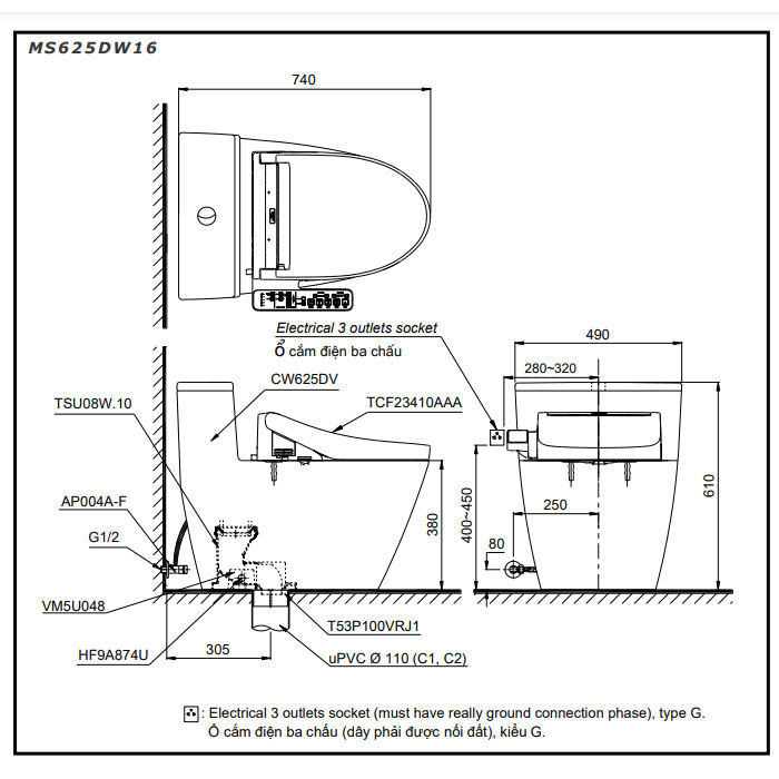 Bản vẽ kỹ thuật bồn cầu 1 khối nắp điện tử TOTO MS625DW16