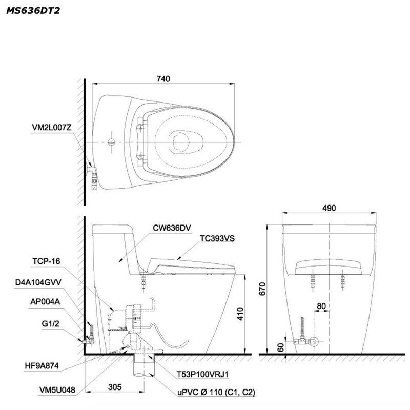 Bản vẽ kỹ thuật bồn cầu TOTO 1 khối MS636DT2