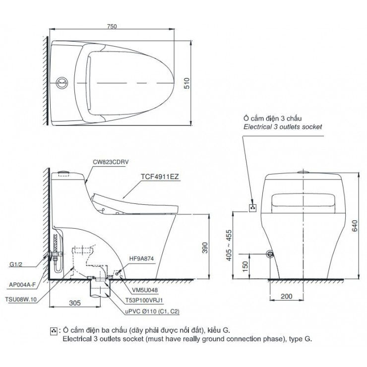 Bản vẽ kỹ thuật bồn cầu 1 khối nắp rửa điện tử S7 TOTO MS823CDRW12