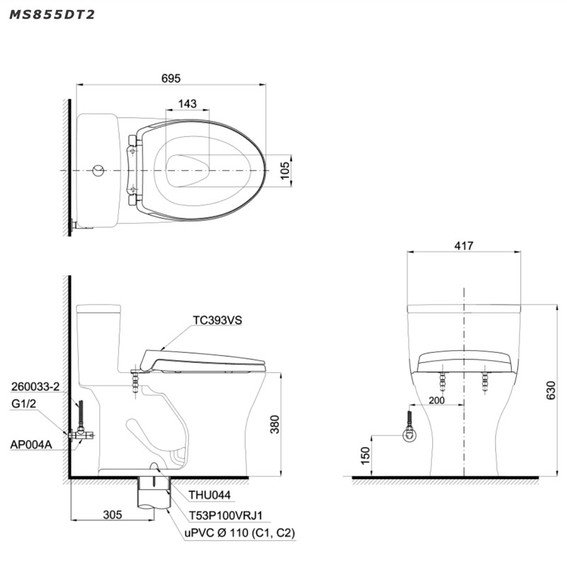 Thông tin của bồn cầu 1 khối TOTO MS855DT2#XW: