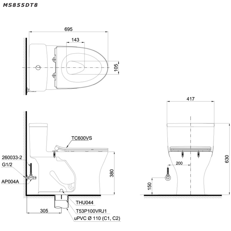 Bản vẽ kỹ thuật bồn cầu TOTO 1 khối MS855DT8