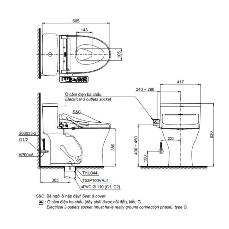 Bản vẽ kỹ thuật bồn cầu 1 khối nắp rửa điện tử WASHLET dòng C2 TOTO MS855DW16