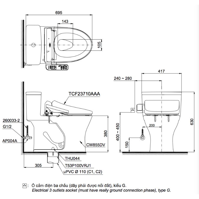Bản vẽ kỹ thuật bồn cầu 1 khối nắp rửa điện tử C2 TOTO MS855DW18#XW