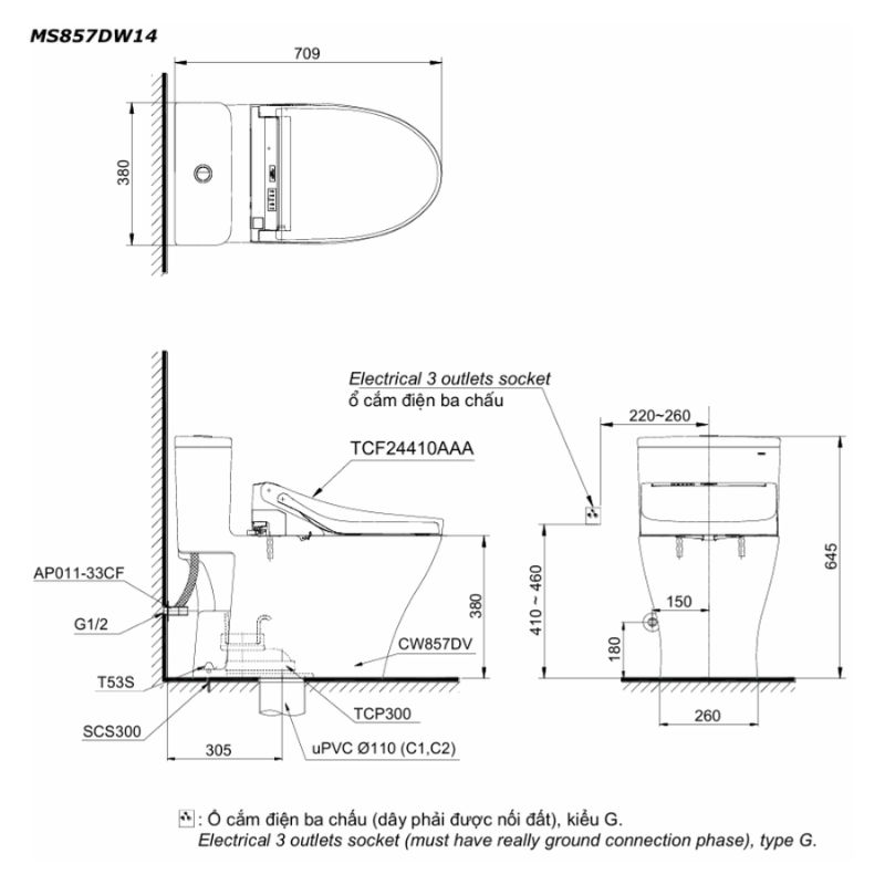 Bản vẽ kỹ thuật của bồn cầu 1 khối TOTO MS857DW14 nắp điện tử Washlet C5