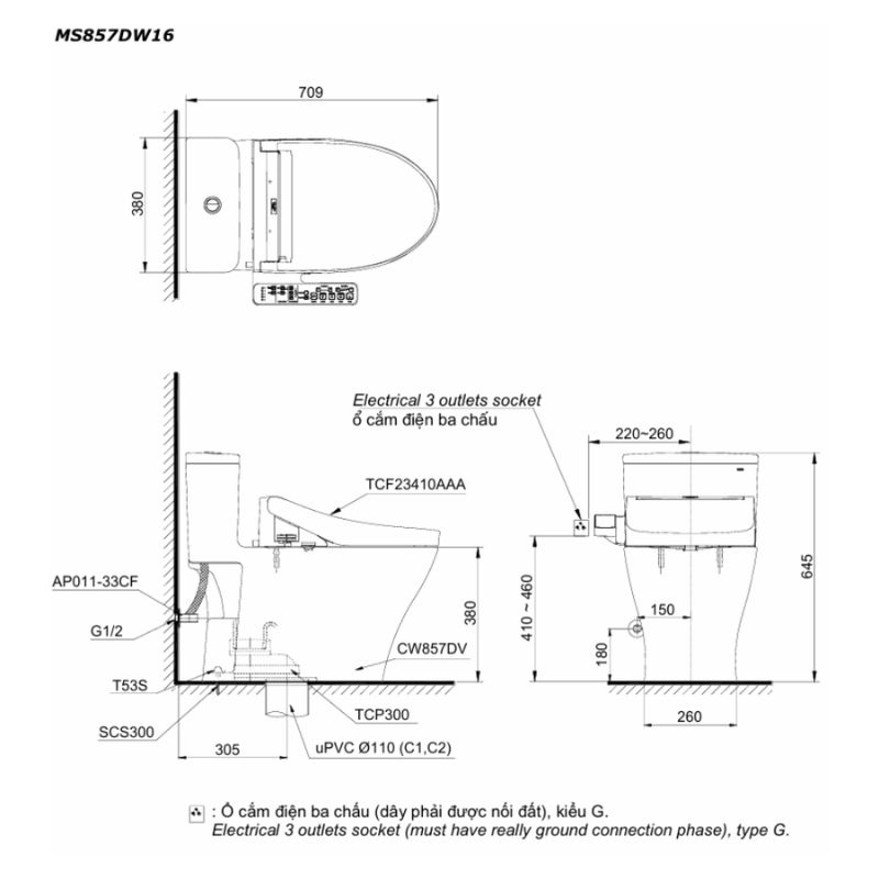 Bản vẽ kỹ thuật của bồn cầu 1 khối nắp điện tử TCF23410AAA TOTO MS857DW16