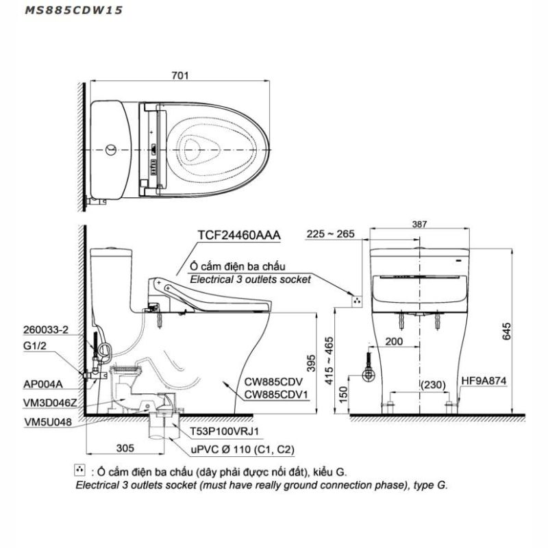 Bản vẽ kỹ thuật bồn cầu 1 khối dấu giây nắp rửa điện tử C5 TOTO MS885CDW15