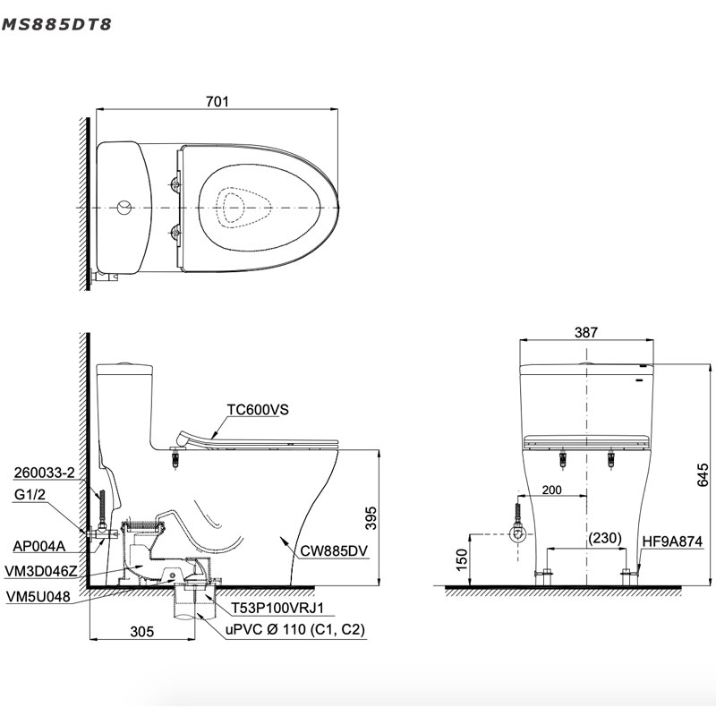 Bản vẽ kỹ thuật bồn cầu TOTO 1 khối MS885DT8