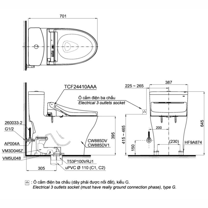 Bản vẽ kỹ thuật bồn cầu 1 khối nắp rửa điện tử C5 TOTO MS885DW14