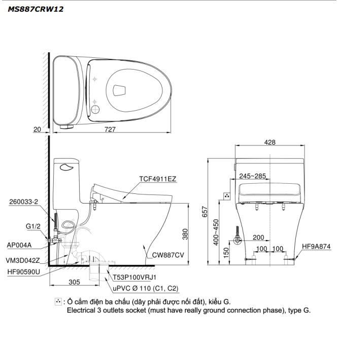 Bản vẽ kỹ thuật bồn cầu nắp rửa điện tử TOTO 1 khối MS887CRW12