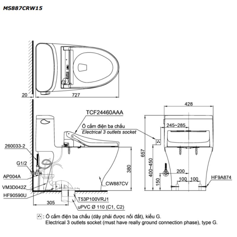 Bản vẽ kỹ thuật bồn cầu 1 khối dấu giây nắp rửa điện tử C5 TOTO MS887CRW15