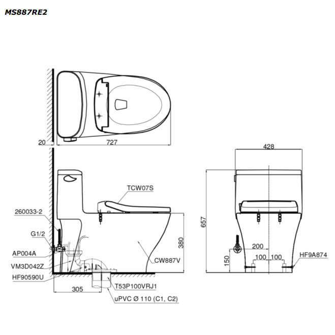 Bản vẽ kỹ thuật bồn cầu TOTO nắp rửa cơ MS887RE2