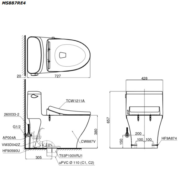 Bản vẽ kỹ thuật bồn cầu TOTO nắp rửa cơ MS887RE4