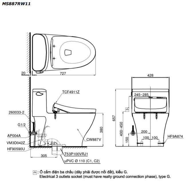 Bản vẽ kỹ thuật bồn cầu nắp rửa điện tử TOTO 1 khối MS887RW11
