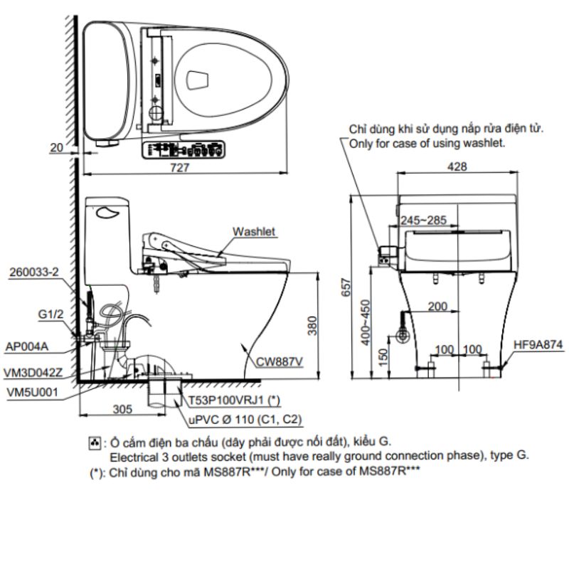 Bản vẽ kỹ thuật bồn cầu 1 khối nắp rửa điện tử WASHLET dòng C2 TOTO MS887RW16