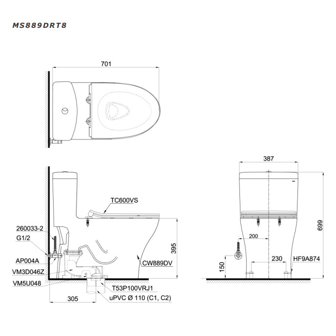 Bản vẽ kỹ thuật bồn cầu TOTO 1 khối MS889DRT8
