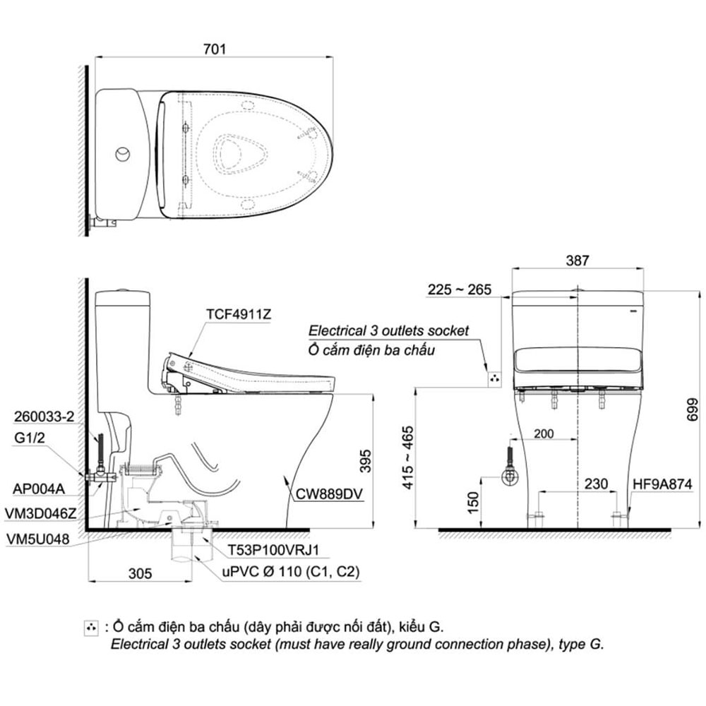 Bản vẽ kỹ thuật bồn cầu nắp rửa điện tử TOTO 1 khối MS889DRW11