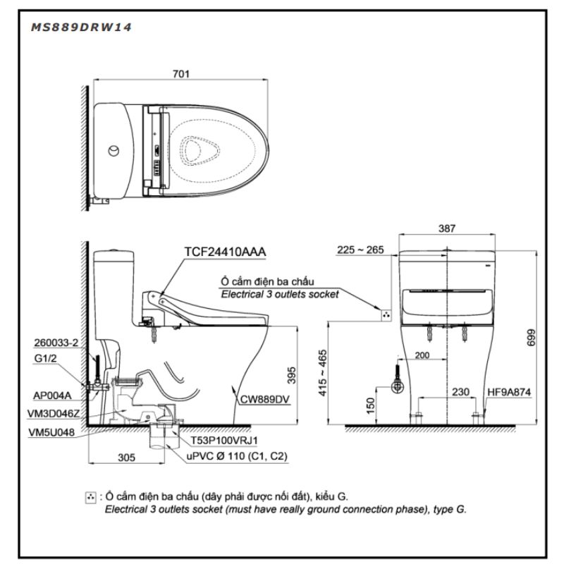 Bản vẽ kỹ thuật bồn cầu 1 khối nắp rửa điện tử C5 TOTO MS889DRW14