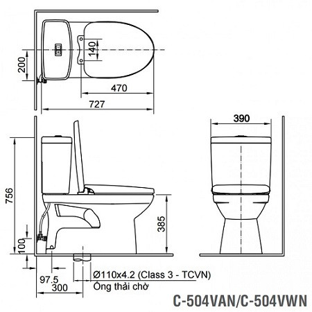 Bản vẽ kỹ thuật của bàn cầu vệ sinh INAX C-504VWN-2