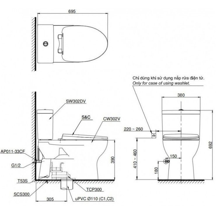 Bản vẽ kỹ thuật bồn cầu 2 khối nắp rửa cơ TOTO CS302DE2