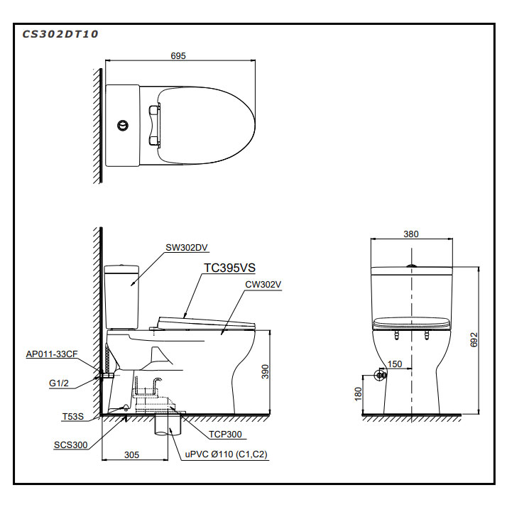 Bản vẽ kỹ thuật bồn cầu 2 khối TOTO nắp êm CS302DT10