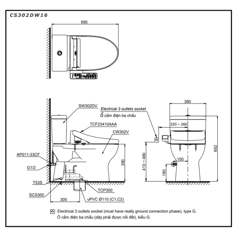 Bản vẽ kỹ thuật bồn cầu 2 khối nắp điện tử TOTO CS302DW16
