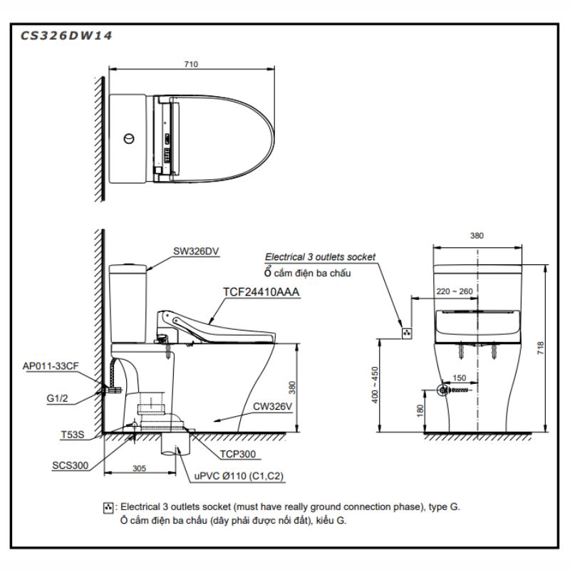 Bản vẽ kỹ thuật bồn cầu 2 khối nắp điện tử TOTO CS326DW14