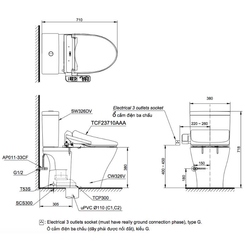 Bản vẽ kỹ thuật bồn cầu 2 khối nắp rửa điện tử C2 TOTO CS326DW18
