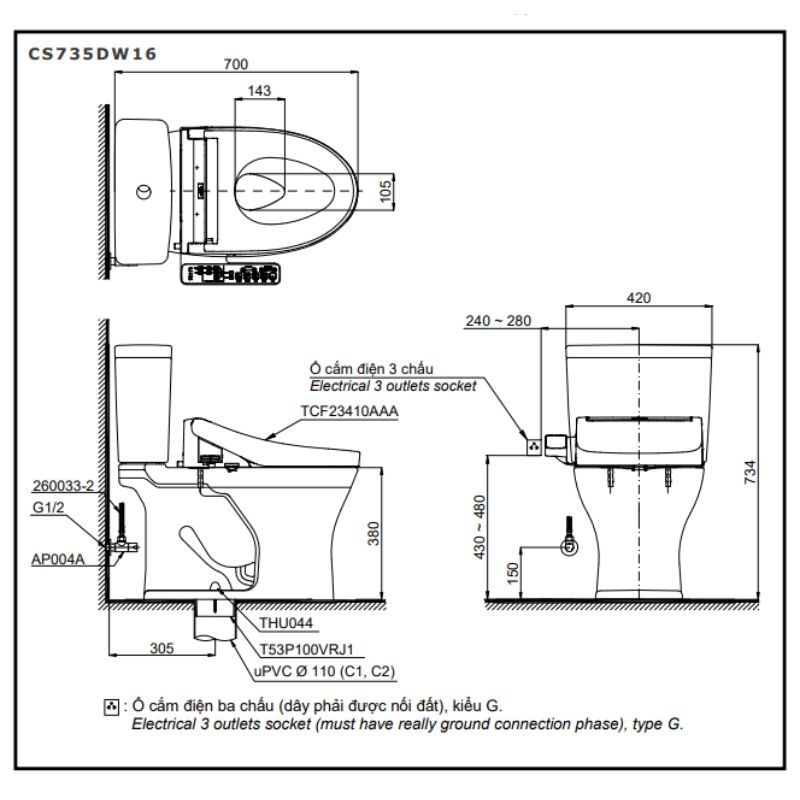 Bản vẽ kỹ thuật bồn cầu 2 khối nắp điện tử TOTO CS735DW16