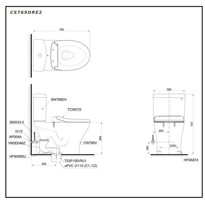 Thông tin của bồn cầu nắp rửa cơ TOTO CS769DRE2#XW: