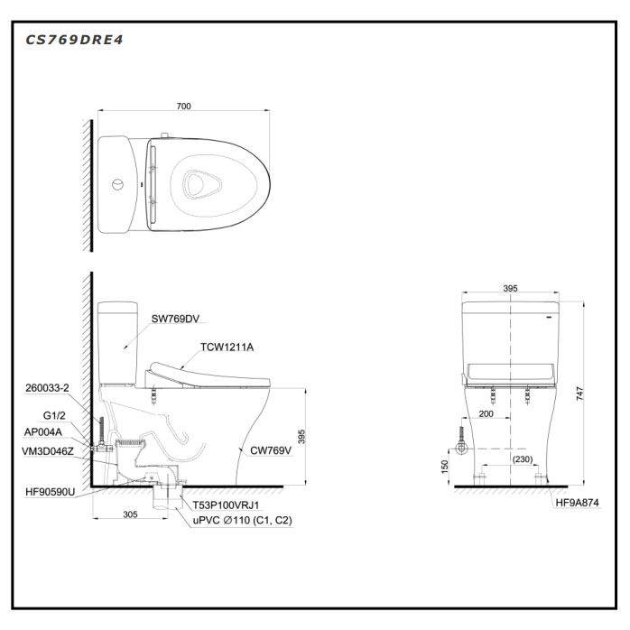 Bản vẽ kỹ thuật bồn cầu TOTO nắp rửa cơ CS769DRE4