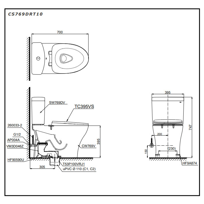 Thông tin của bồn cầu 2 khối TOTO CS769DRT10#XW: