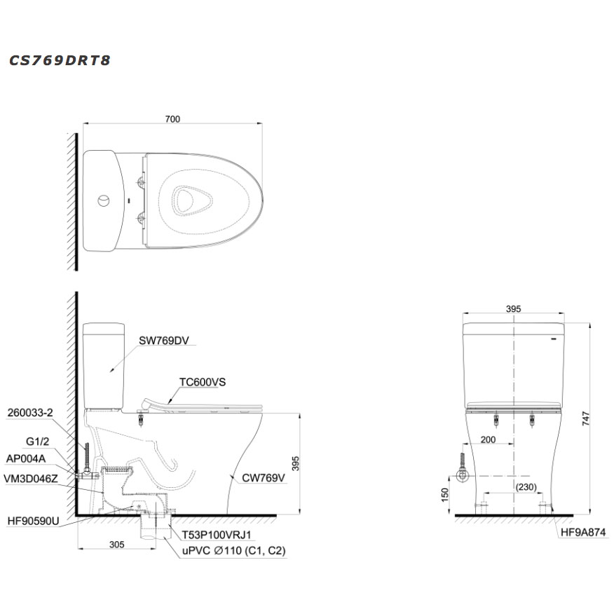 Bản vẽ kỹ thuật bồn cầu TOTO 2 khối CS769DRT8