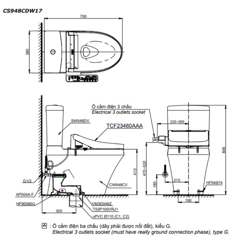 Bản vẽ kỹ thuật bồn cầu 2 khối nắp rửa điện tử WASHLET (loại giấu dây) dòng C2 TOTO CS948CDW17