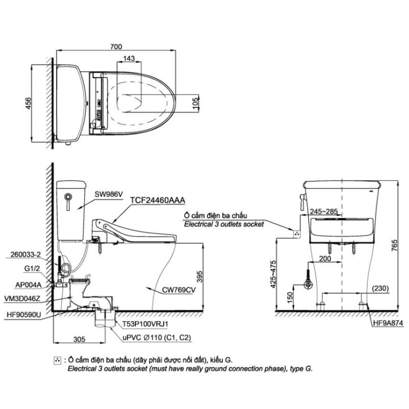Bản vẽ kỹ thuật bồn cầu 2 khối dấu giây nắp rửa điện tử C5 TOTO CS986CGW15