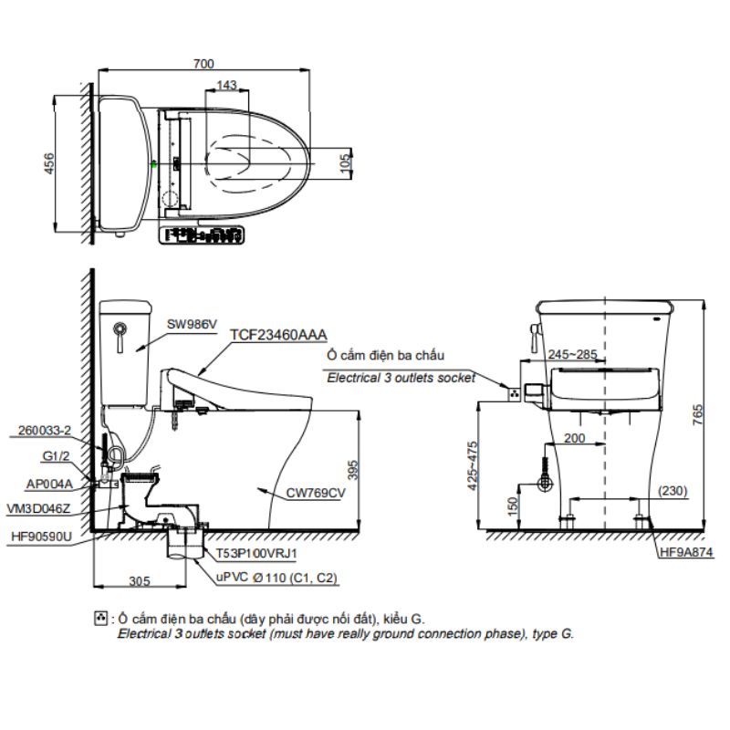 Bản vẽ kỹ thuật bồn cầu 2 khối nắp rửa điện tử WASHLET (loại giấu dây) dòng C2 TOTO CS986CGW17