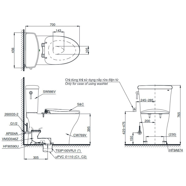 Bản vẽ kỹ thuật bồn cầu 2 khối TOTO nắp rửa cơ CS986GE2