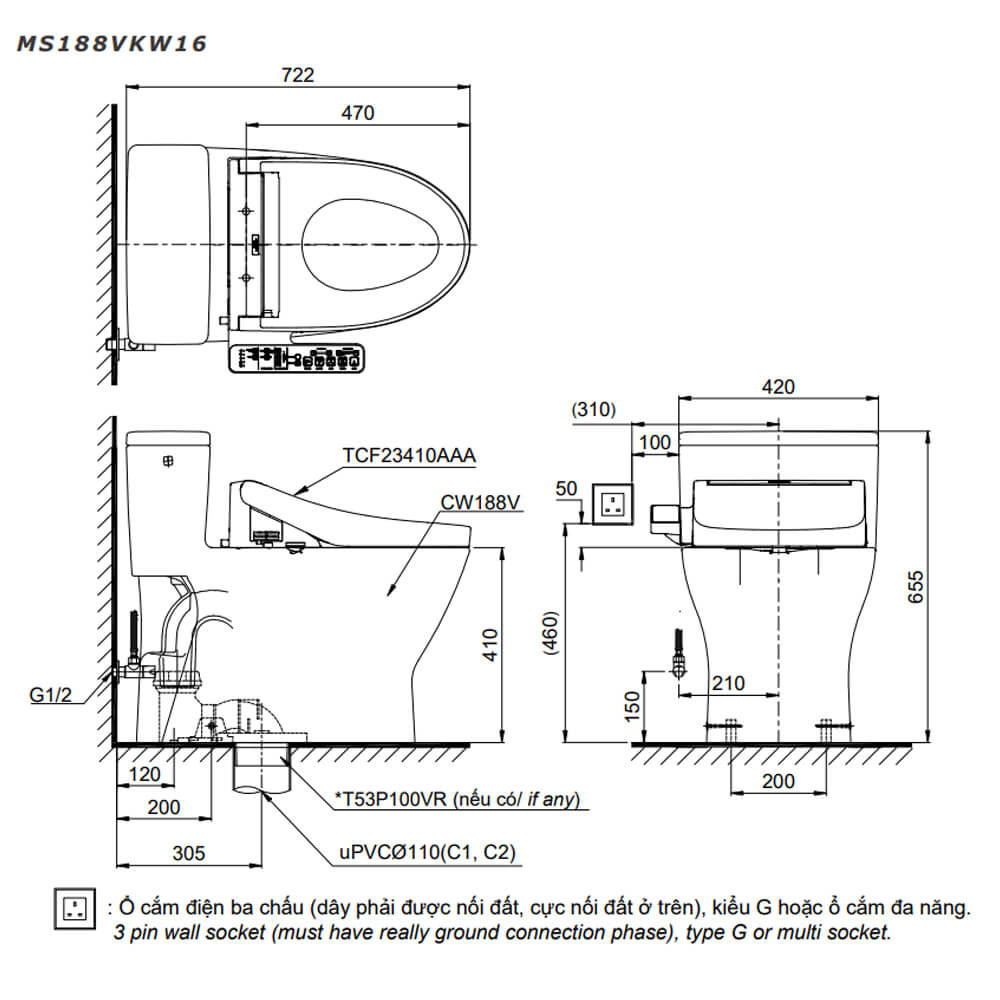 Bản vẽ kỹ thuật bồn Cầu 1 Khối Nắp Điện Tử TOTO MS188VKW16/T53P100VR