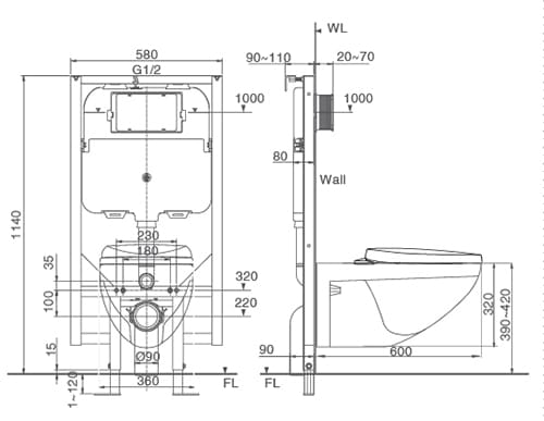 - Thiết kế két nước âm trong tường, nút nhấn xả nằm trên mặt tường, chỉ còn bệ ngồi bên ngoài tạo sự tối giản tuyệt đối & tính thẫm mỹ cao cho không gian nhà vệ sinh.