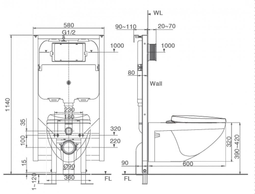 - Tâm thoát: 180mm