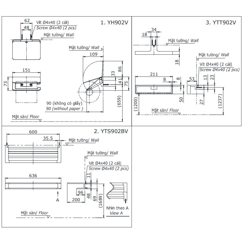 | Thanh vắt khăn 2 tầng YTS902BV | 636 x 200 x 69 mm |
