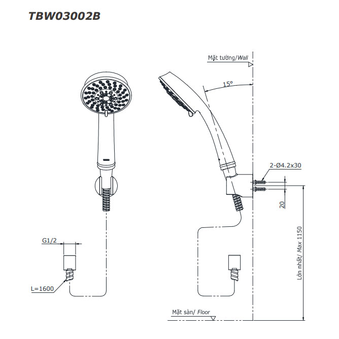• Áp lực nước khuyến nghị: 0.1 - 0.5 MPa