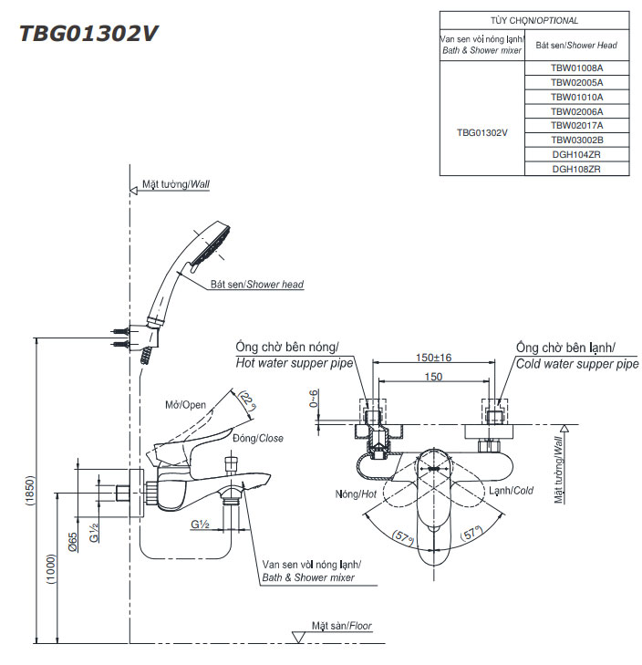 Thông tin của bộ sen cây tắm đứng TOTO TBW01002BA/TBG01302VA/TBW01010A: