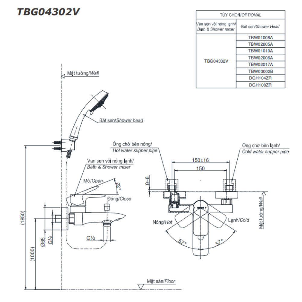 Thông tin của bộ sen cây tắm đứng TOTO TBW02001BA/TBG04302VA/TBW02005A: