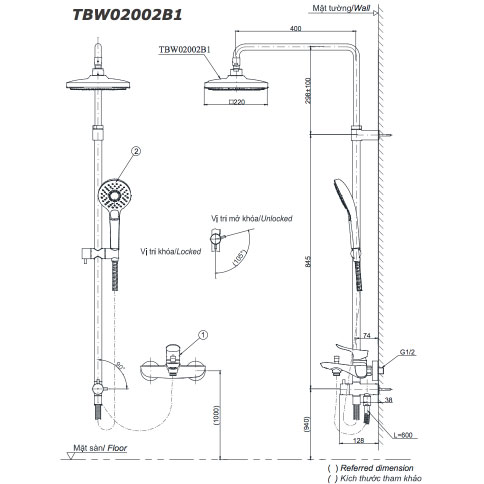 Bản vẽ kỹ thuật bộ vòi sen cây tắm đứng nóng lạnh TOTO TBW02002BA TBG02302VA TBW02017A