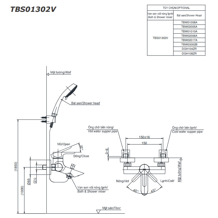Bản vẽ kỹ thuật bộ sen cây tắm nóng lạnh TOTO DM907CS TBS01302V DGH104ZR