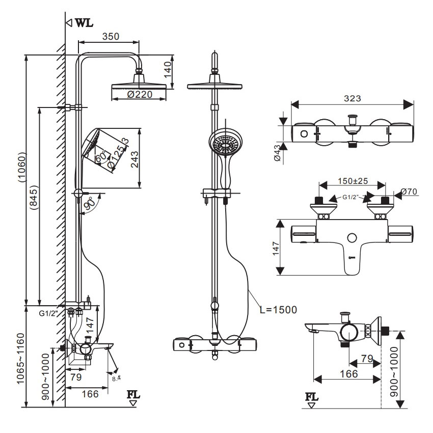 Bản vẽ kỹ thuật bộ sen tắm cây đứng nhiệt độ INAX BFV-3415T